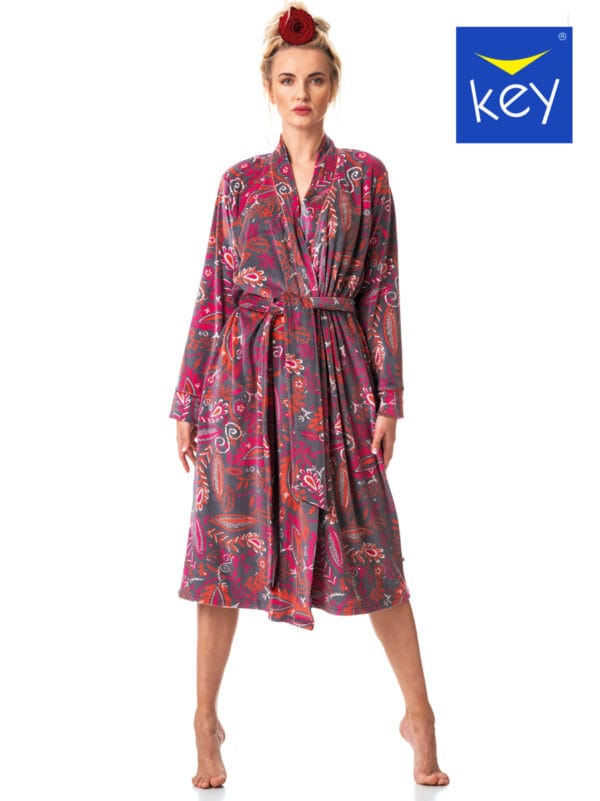 Szlafrok damski długi z kołnierzem uszyty z wzorzystej tkaniny. Luźny, wygodny krój. Skład: 95% poliester,5% elastan.