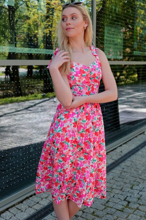 Sukienka wyróżnia się efektownym wiązaniem ramiączek, które doda dziewczęcego wdzięku każdej stylizacji. Jej krój podkreśli talię i okolice dekoltu. Luźno puszczona tkanina doda lekkości całości. Letnia zwiwena sukienka za kolano.