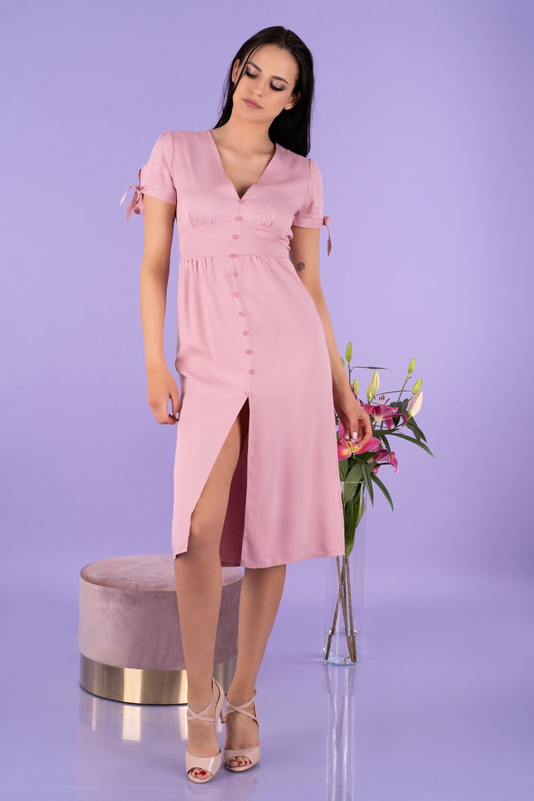 Sukienka o długości midi, z krótkim rękawem i podwyższoną talią.
