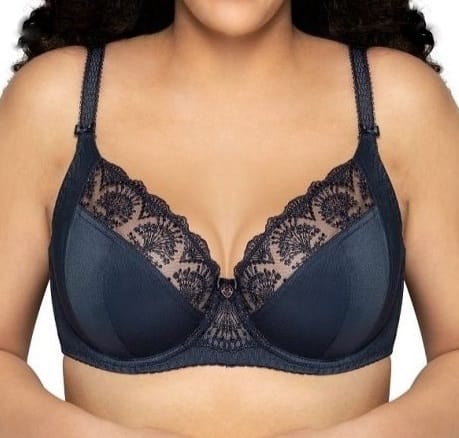 Biustonosz miękki ze sprężystej dzianiny, w górnej linii tiulowa siateczka zdobiona kwiatowym motywem. Panel boczny stabilnie podtrzymuje biust. Ramiączka nieodpinane. Skład: 88% poliamid, 8% bawełna, 4% elastan.