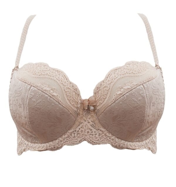 Biustonosz półusztywniany. Górna miska oraz bawet wykonane z bogato zdobionej koronki. Dolna miska obszyta żakardową dzianiną. Boczki biustonosza wykonane są z grubej dzianiny. Pionowe fiszbiny boczne. Ramiączka nie odpinają się.
