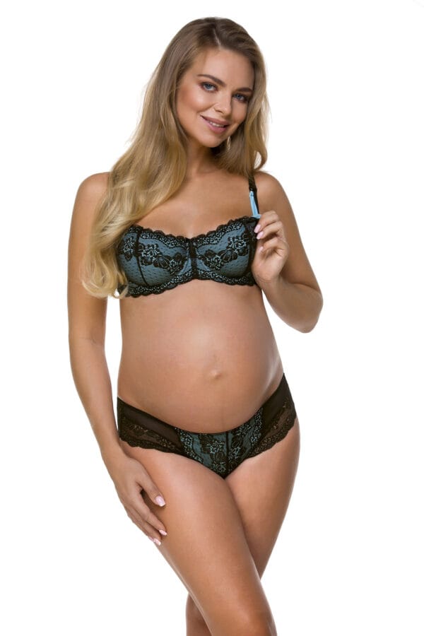 Elegancki, a zarazem praktyczny biustonosz do karmienia, zachowany w niebiesko-czarnej kolorystyce. Posiada miękkie miski na fiszbinach, wnętrze podszyte jest bawełną. Ramiączka regulowane z zapięciem Clic-Clack. Do kompletu spodenki zachowane w tej samej kolorystyce.