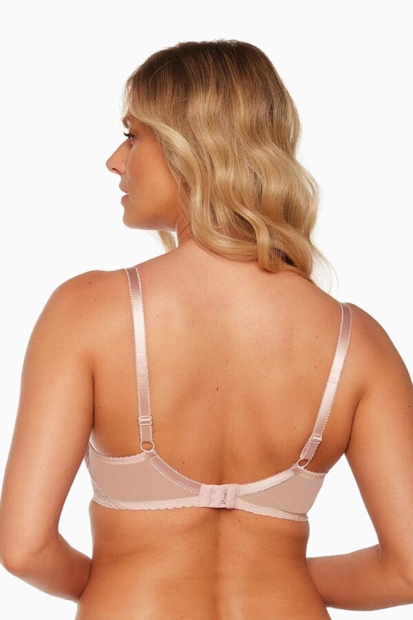 Biustonosz typu soft, na fiszbinach. Miseczki z efektownej koronki, podszyte siateczką. Ramiączka, nieodpinane, regulowane. Obwód z gładkiej siateczki, bez bocznej fiszbiny. Konstrukcja SB6. Skład: 52% poliester, 36% poliester, 12% elastan.