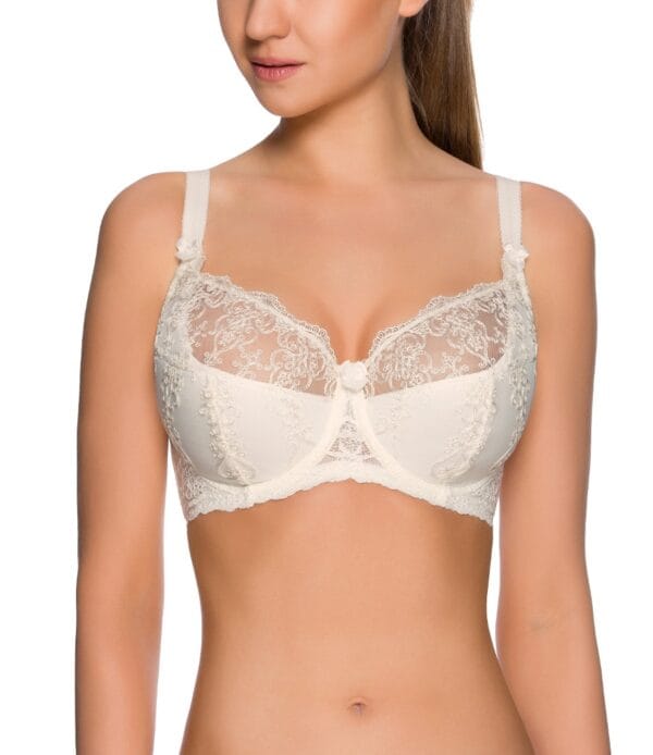 Elegancka koronka w górnej części misek, na mostku i boczkach przyciąga uwagę.