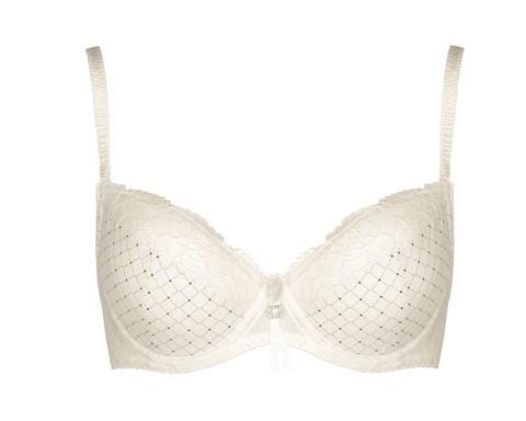 Biustonosz na fiszbinach z usztywnianymi miseczkami typu full cup. Górna część miseczek wykończona koronką, dolna z geometrycznym nadrukiem w kontrastowym kolorze.