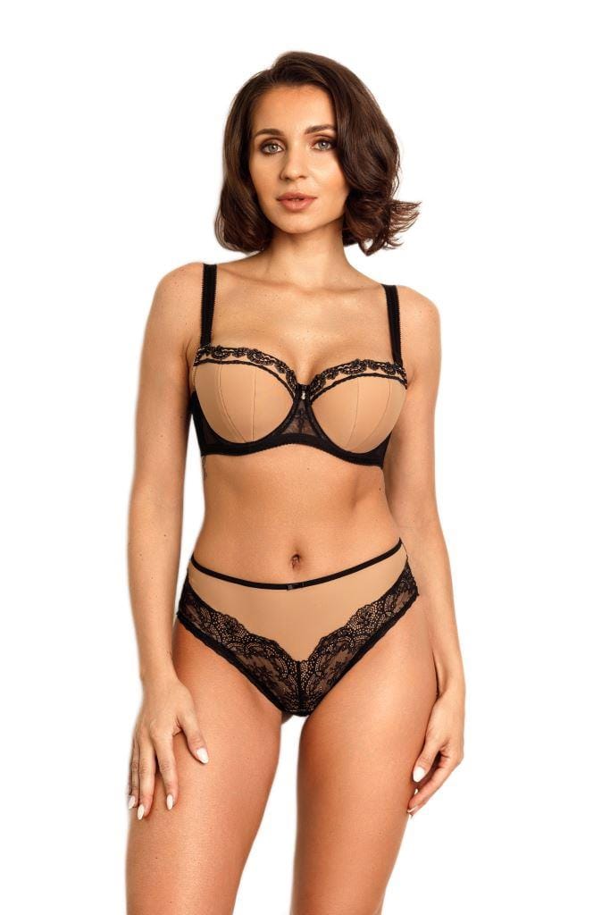 – delikatna mikrofibra w kolorze karmelowym została połączona z czarną, haftowaną taśmą, którą została obszyta górna krawędź miski biustonosza,