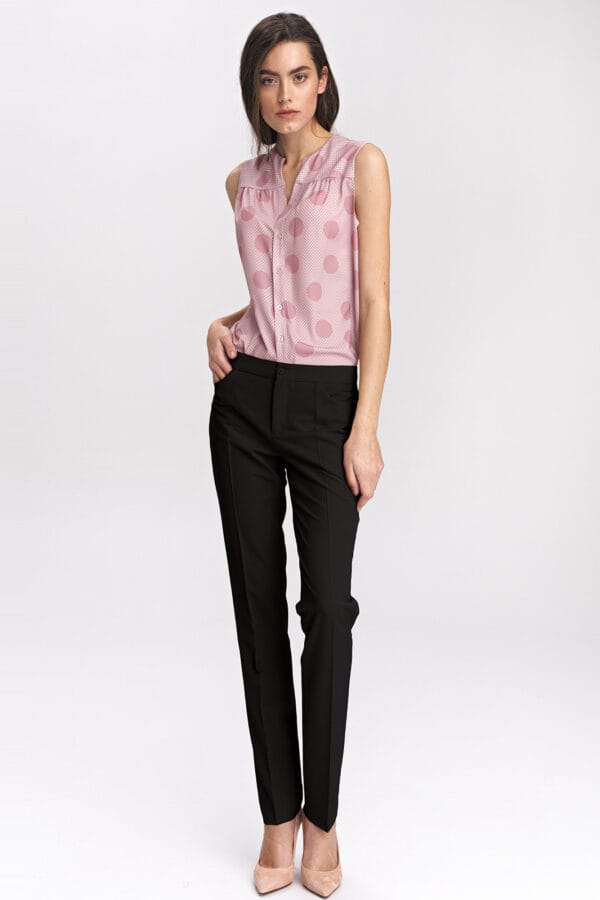 Czarne klasyczne spodnie damskie świetnie odnajdą się jako element stylizacji soft-office. Dopasowana linia pięknie podkreśla kobiece kształty, a ponadczasowy fason sprawia, że spodnie pasują do marynarek i żakietów o wszelkich krojach. Przyjemny w dotyku materiał, z domieszką wiskozy, zapewnia wysoki komfort noszenia. Skład: 60% poliester, 35% wiskoza, 5% elastan Modelka na zdjęciu ma 176 cm wzrostu i ma na sobie rozmiar 36.