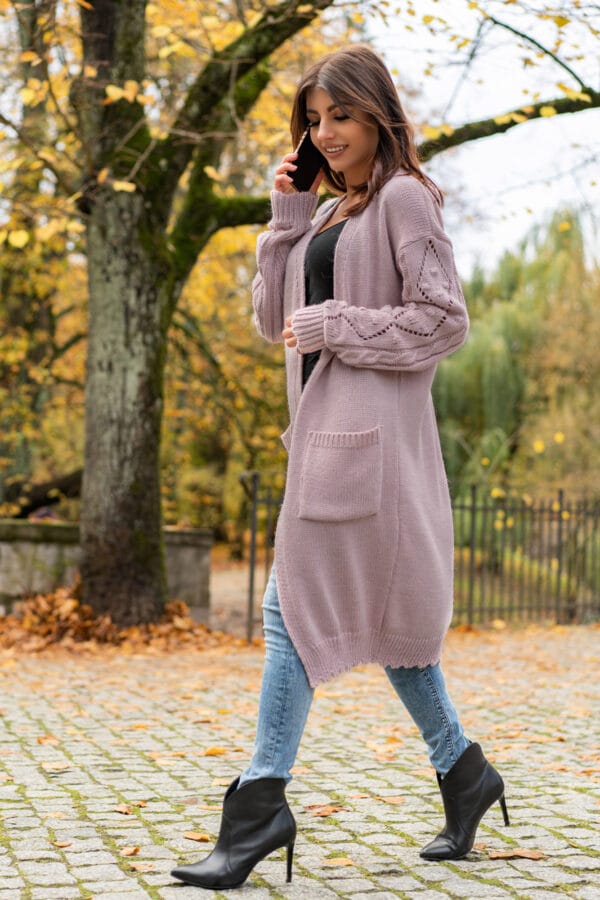 Długi sweter za kolano o płaszczowym kroju. Dekolt w serek, długi rękaw, po bokach kieszenie.