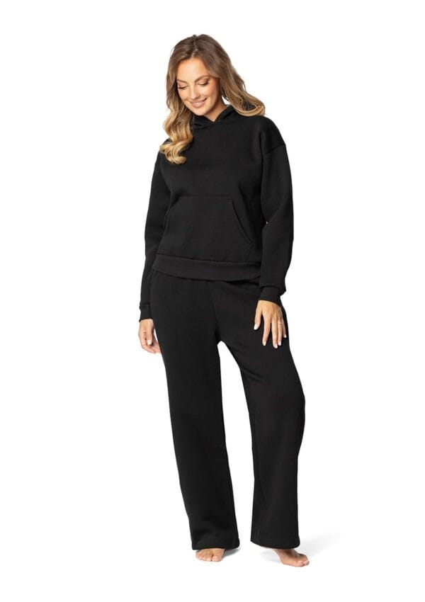 Dres składa się ze spodni o szerokich nogawkach, które zapewniają swobodę ruchu, oraz bluzy kangurki z praktycznymi kieszonkami. Spodnie są wyposażone w elastyczną gumkę w pasie, co sprawia, że idealnie dopasowują się do sylwetki i zapewniają wygodę przez cały dzień. Bluza kangurka, z charakterystyczną przednią kieszenią, jest idealna do ogrzewania rąk lub przechowywania drobnych przedmiotów.
