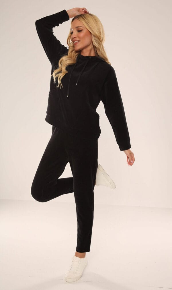 Dres damski wykonany z przyjemnej dla ciała bawełny. Bluza z długim rękawem i kapturem. Na wysokości brzucha kieszenie. Do kompletu długie spodnie, pas zakończony ściągaczem. Skład: 80% bawełna, 20% poliamid.