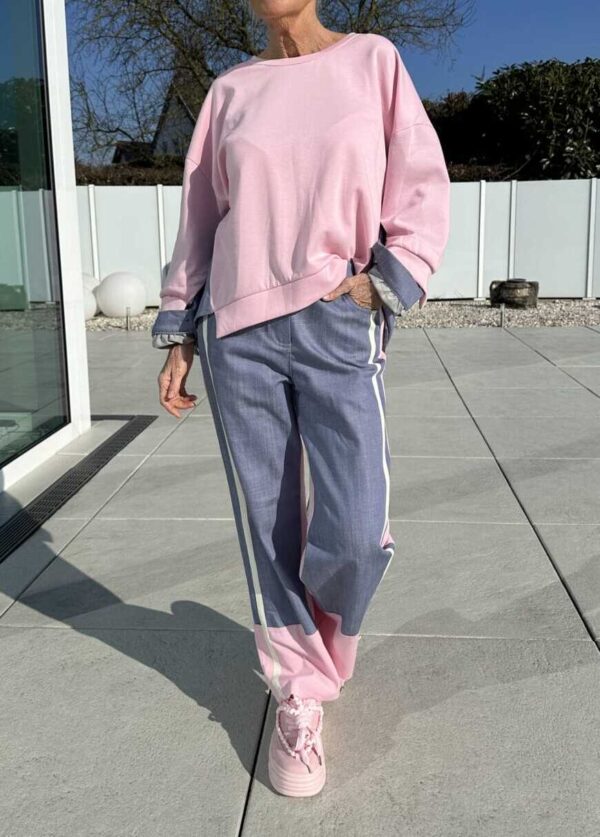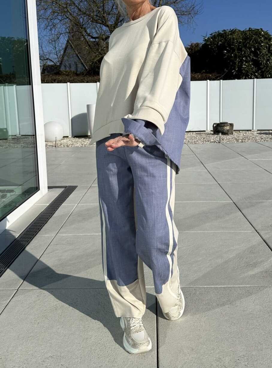 Spodnie mają efektowny, dwukolorowy krój, z przodu przypominają jeans dzięki kontrastowym panelom, natomiast tył wykonano z gładkiego materiału w kolorze waniliowym lub różowym – w zależności od wersji kolorystycznej.
