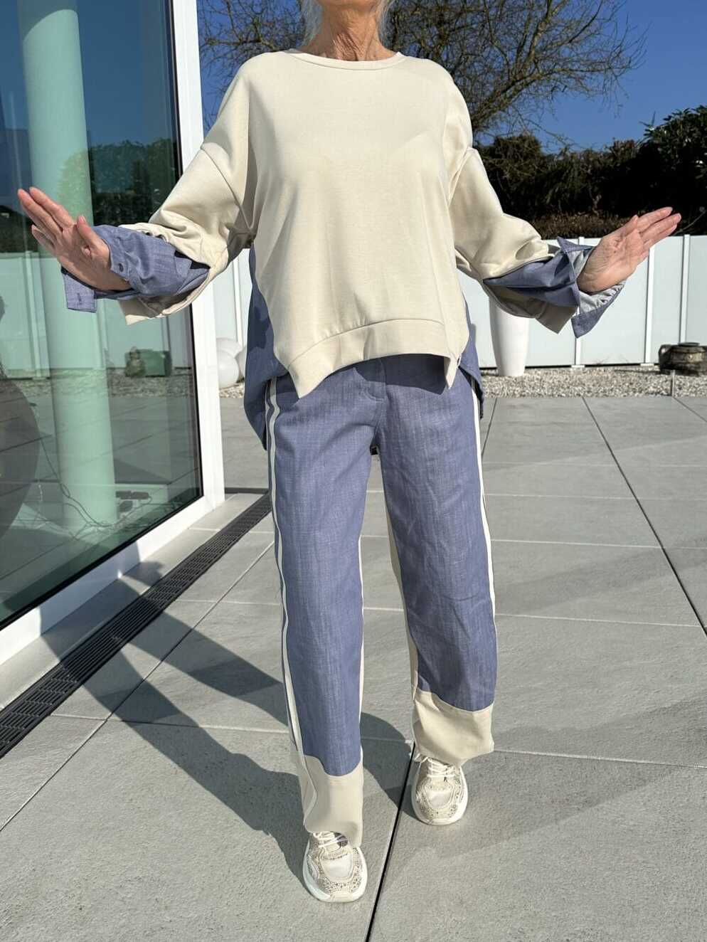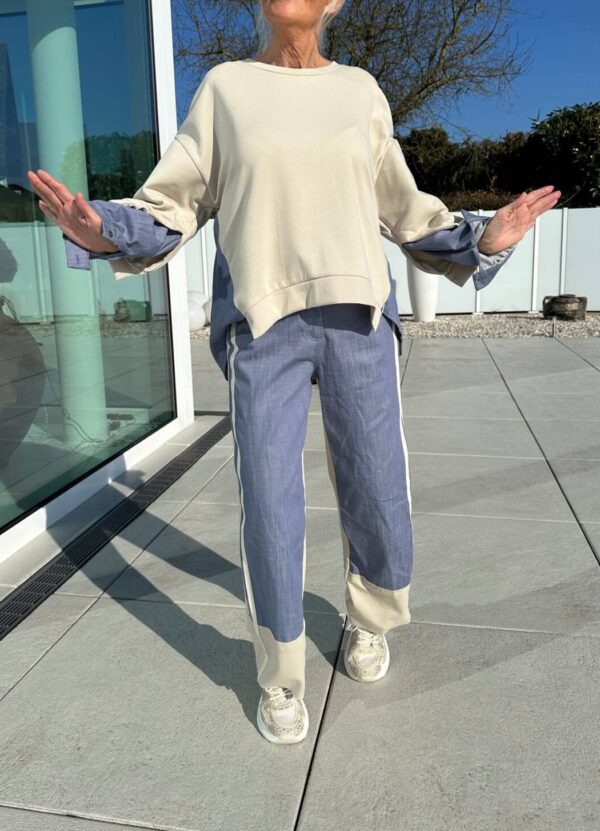 ✨ Bluza utrzymana jest w stonowanym odcieniu wanilii lub różu i uzupełniona denimowymi akcentami na rękawach zakończonych mankietami, co dodaje jej charakteru i nowoczesności.