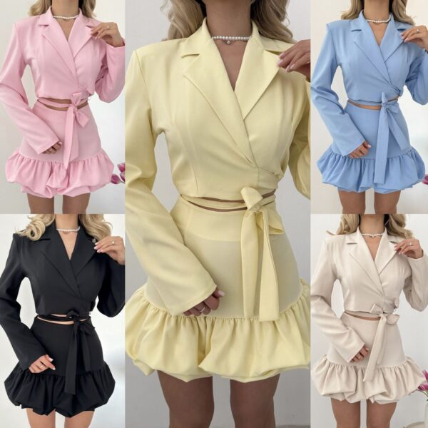 ✨ Składający się z perfekcyjnie skrojonego żakietu z wiązaniem w talii oraz spódnicy z falbankami o wysokim stanie, ten zestaw zachwyca detalami i wszechstronnością.