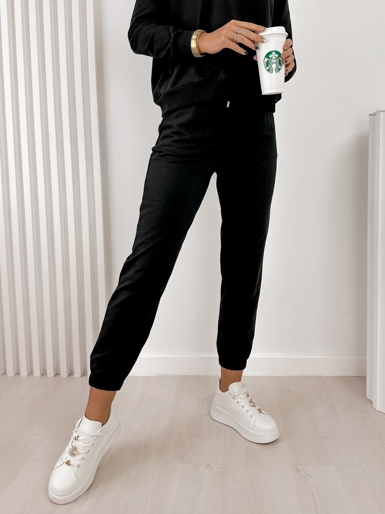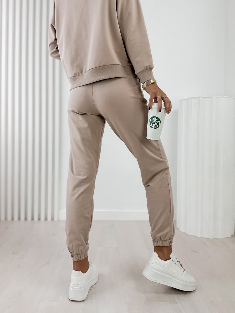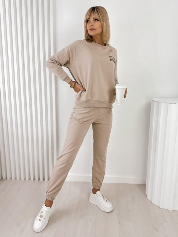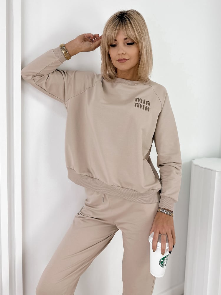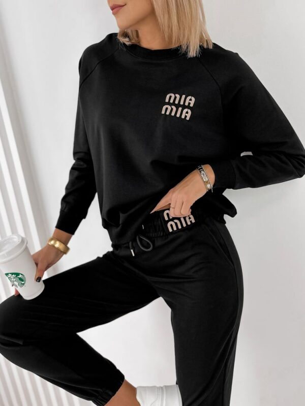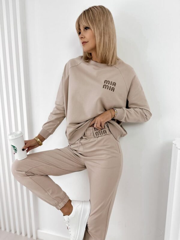 Komplet posiada ozdobny naszywany napis MIA MIA, na bluzie i spodniach w kolorze złotym. Dodaje on elegancji całemu zestawowi.