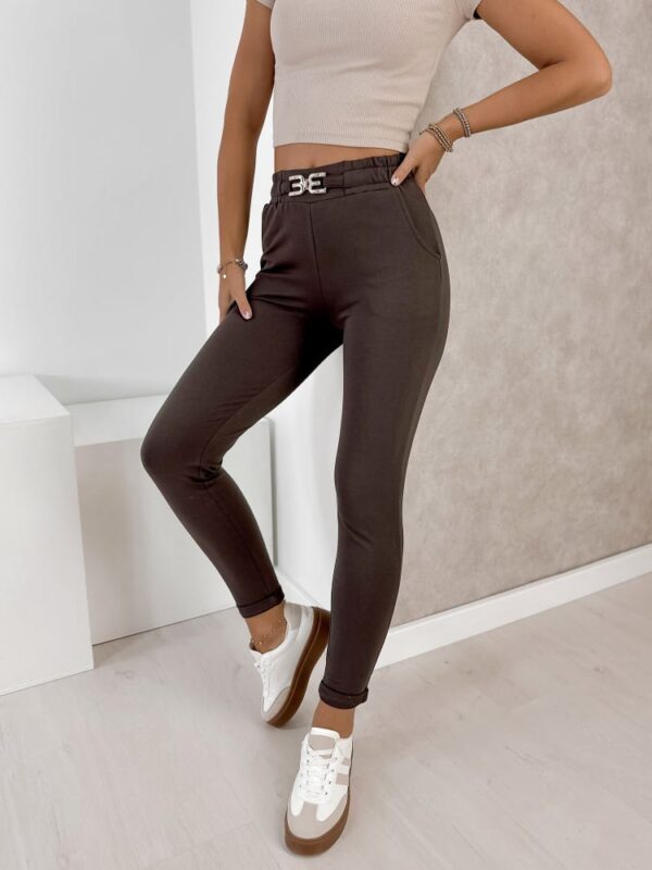 Obcisłe spodnie w dwóch dostępnych kolorach: najmodniejszy kolor jesieni 2025/26r. i ciemno beżowy. Spodnie na szerokiej gumce z ozdobnym elementem w pasie. Wygodne, elastyczne, dopasowują się do ciała.