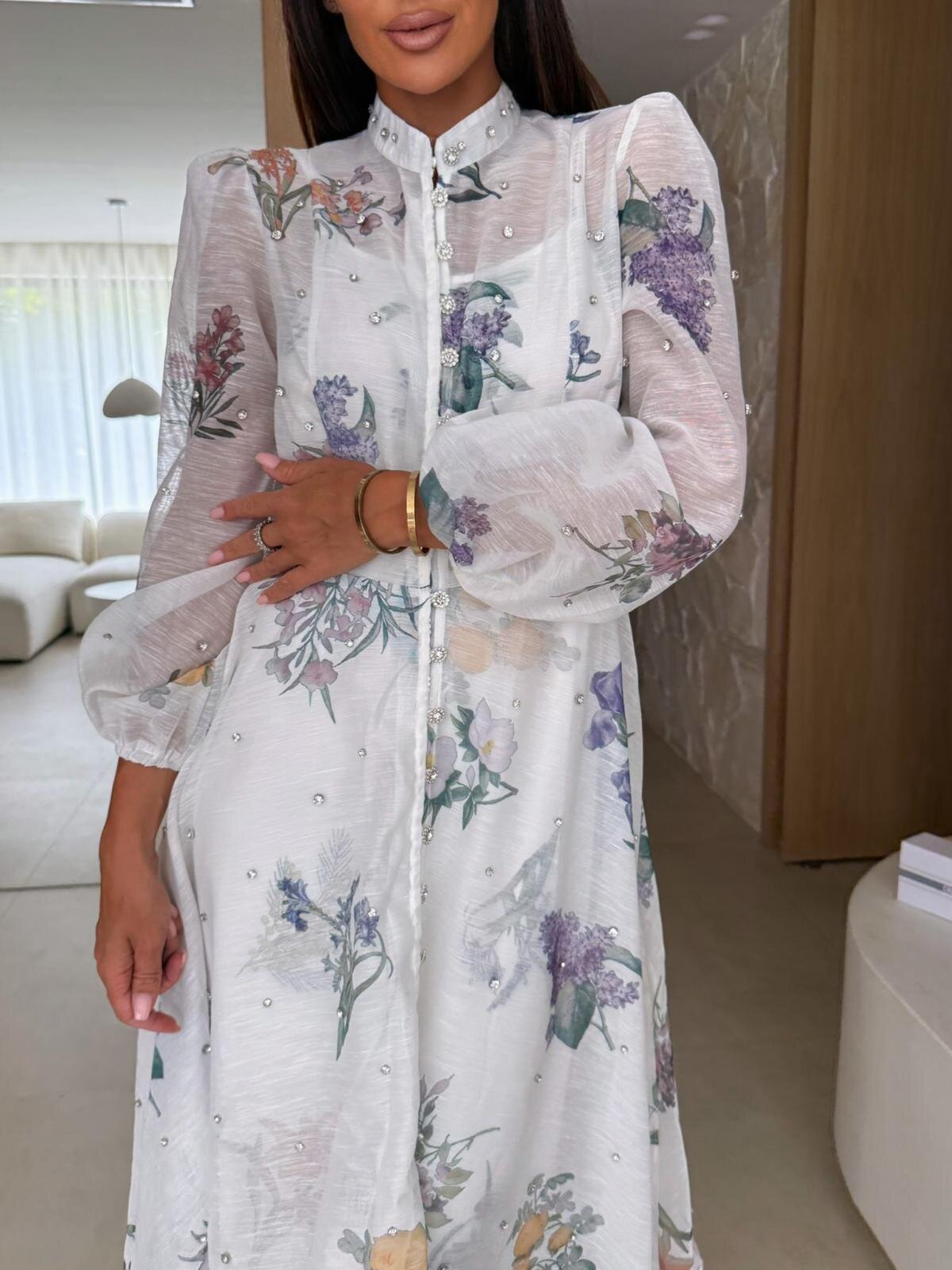 Ta sukienka to wyjątkowa propozycja dla kobiet ceniących elegancję, kobiecość i lekkość. Koszulowy fason z długim rękawem, efektowny florystyczny print i subtelny połysk ozdobnych dżetów sprawiają, że model ten zachwyca w każdej stylizacji. Dodatkowym atutem jest materiałowy pasek, który pięknie podkreśla talię, oraz podszewka, zapewniająca komfort noszenia.